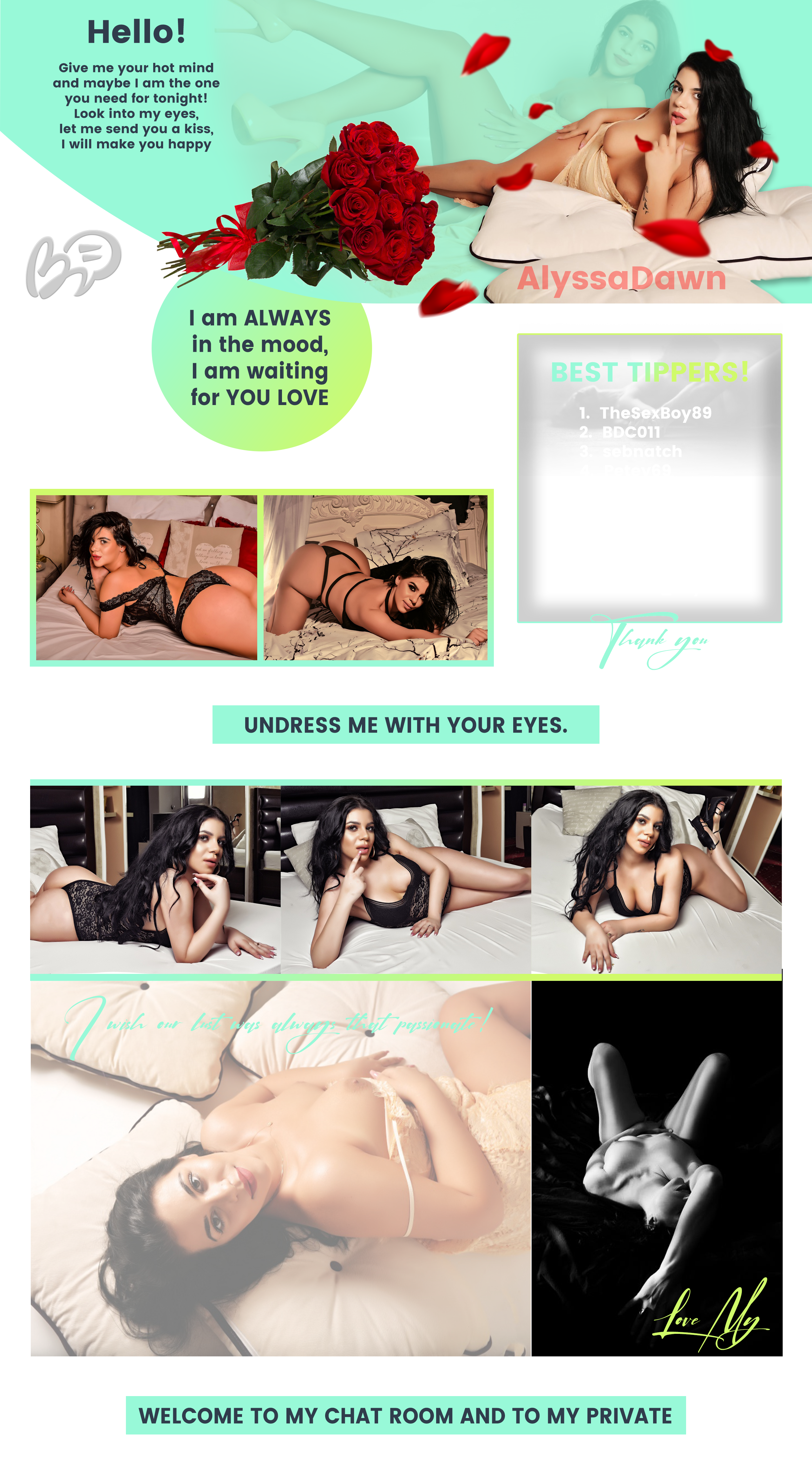 Klõpsates nupul, tõstad AlyssaDawn esilehel 60 sekundiks esimesele kohale. Selle aja jooksul paistab modelli jututuba hästi silma ja kogub populaarsust! Teavitus sinu tegevuse kohta ilmub ka jutuaknas ning seda näevad modell ja teisedki vestluses osalejad. AlyssaDawn hindab seda väga ja on sulle kindlasti tohutult tänulik!