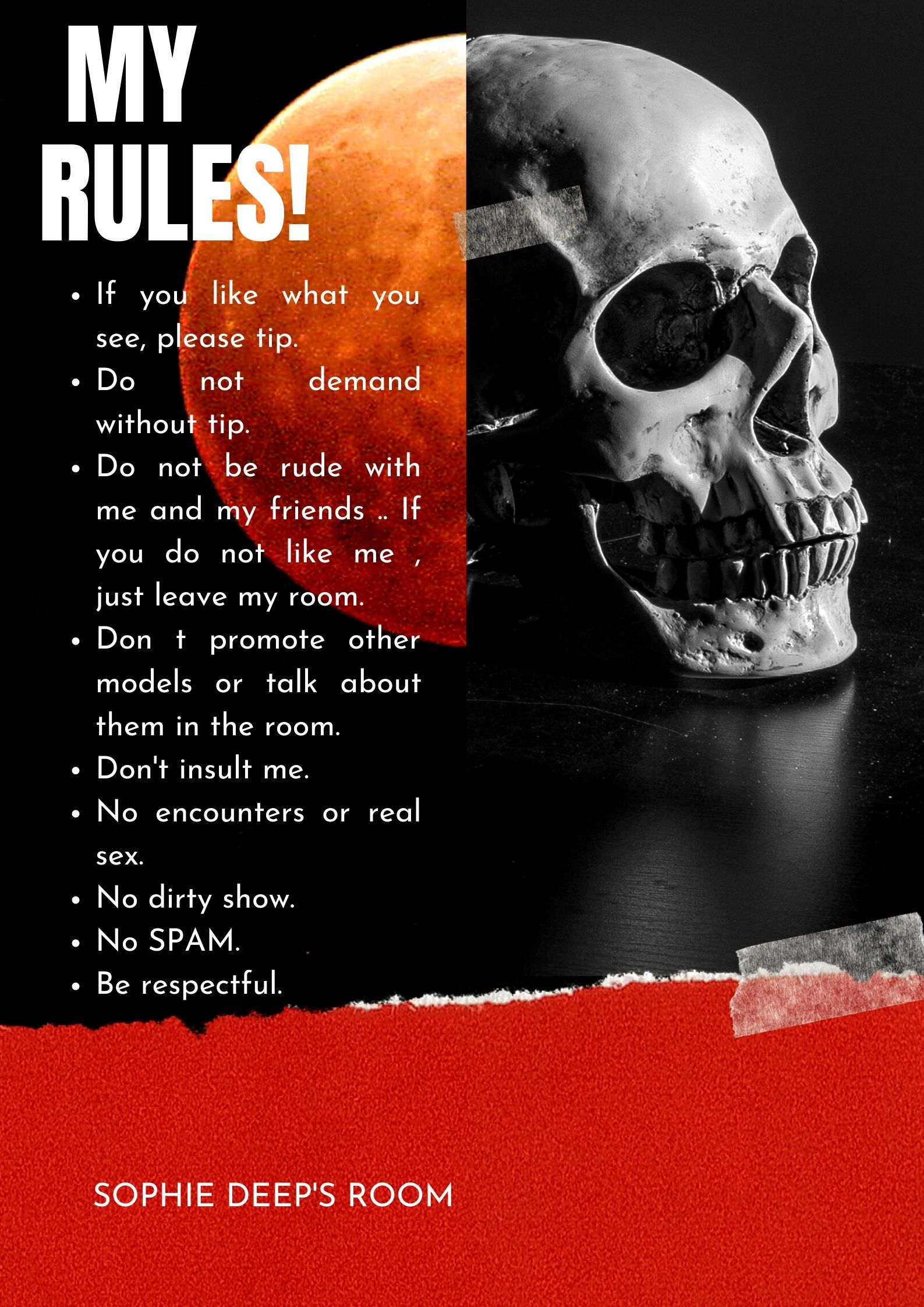 ⛔ Please say ''Hello '' in the chat room when you enter the room ! ⛔ If you like what you see, please tip . ⛔ Do not demand without tip. ⛔Do not be rude with me and my friends .. If you do not like me , just leave my room. ⛔ Don t promote other models or talk about them in the room. ❌Don't insult me ❌No encounters or real sex ❌No dirty show ❌No SPAM ✔️Be respectful