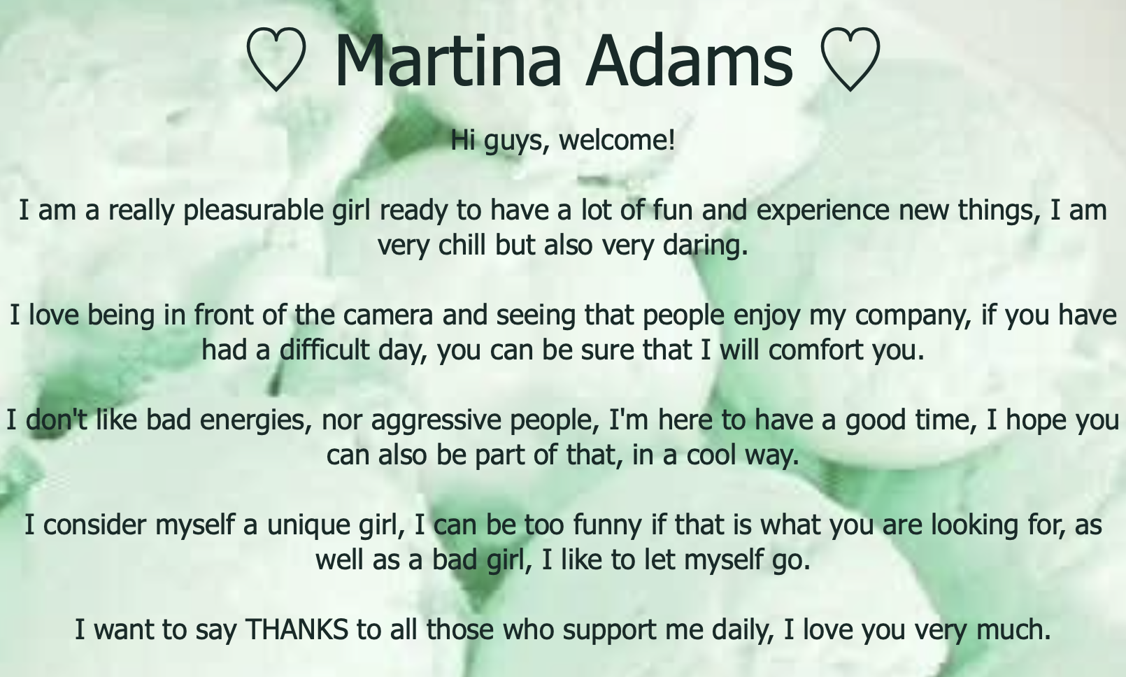 Klõpsates nupul, tõstad MartinaAdams esilehel 60 sekundiks esimesele kohale. Selle aja jooksul paistab modelli jututuba hästi silma ja kogub populaarsust! Teavitus sinu tegevuse kohta ilmub ka jutuaknas ning seda näevad modell ja teisedki vestluses osalejad. MartinaAdams hindab seda väga ja on sulle kindlasti tohutult tänulik!