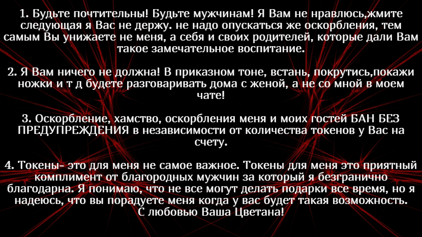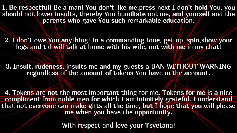 My name is Tsvetana and I am pleased to welcome you in his Flirt-chat. What turns me on? Of course Intelligence is the first and most important thing that excites a man. Well, all the other advantages-also great and important, but only an intelligent man knows how to optimally dispose of the rest :).After all, only a smart man knows how to win a woman, how to make her feel good with the help of a small( or large;-) prize, how to maintain a conversation, laugh and win over..If you are a smart, educated, confident and generous man, then you are welcome!!!